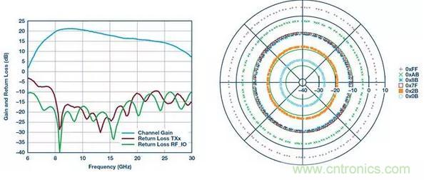 圖5顯示了具有全360°相位覆蓋的增益和相位控制,可以實(shí)現(xiàn)小于2.8°的相位步長(zhǎng)和優(yōu)于31 dB的增益控制。ADAR1000集成片上存儲(chǔ)器,可存儲(chǔ)多達(dá)121個(gè)波束狀態(tài),其中一個(gè)狀態(tài)包含整個(gè)IC的所有相位和增益設(shè)置。發(fā)射器提供大約19 dB的增益和15 dBm的飽和功率,其中接收增益約為14 dB。另一個(gè)關(guān)鍵指標(biāo)是增益控制的相位變化,其在20 dB范圍內(nèi)約為3°。同樣,在整個(gè)360°相位覆蓋范圍內(nèi),相位控制的增益變化約為0.25 dB,緩解了校準(zhǔn)難題。
