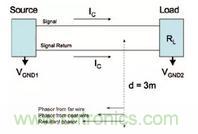 圖1:電路回路中的共模電流。電路中的源是一個數(shù)字信號(帶諧波),其負載被假定為阻性。因為遠端導(dǎo)線上的相電流和近端導(dǎo)線上的相電流的流向是相同的,所以其合成相量相較于差模電流產(chǎn)生的相量會更大。在這種情況下,為了限制輻射發(fā)射的水平,降低諧波成分的大?。p慢數(shù)字信號的上升/下降時間)或者轉(zhuǎn)移/限制共模電流是非常重要的。