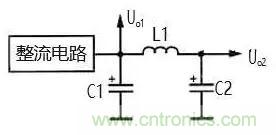 在圖 5 的電路中,整流電路輸出的單向脈動(dòng)性直 流電壓先經(jīng)電容 C1 濾波,去掉大部分交流成分,然后 再加到 L1 和 C2 濾波電路中。