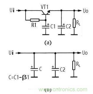 ①電路中的 VT1、 R1、 C1 組成電 子濾波器電路,這 一電路相當(dāng)于一 只容量為 C1×β1 大小電容器,β1 為 VT1 的電流放 大倍數(shù),而晶體管 的電流放大倍數(shù) 比較大,所以等效 電容量很大,可見 電子濾波器的濾 波性能是很好的。等效電路如圖 6(b)所示。圖中 C 為 等效電容。