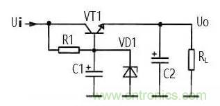 圖 7 所示是另一種電子穩(wěn)壓濾波器,與前一種電 路相比,在 VT1 基極與地端之間接入了穩(wěn)壓二極管 VD1。電子穩(wěn)壓原理如下: