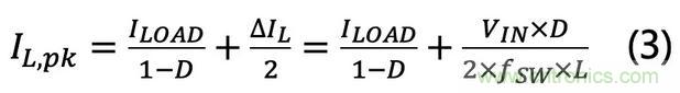 假設升壓轉換器在連續(xù)導通模式 ( Continuous Conduction Mode, CCM) 下工作,峰值電感電流可從公式(1)和(2)得出,具體計算如下: