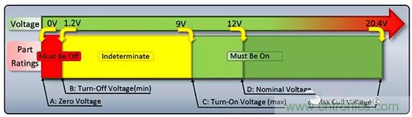 從1.2VDC到9VDC, 繼電器處于不確定的范圍內。(黃色區(qū)域)
