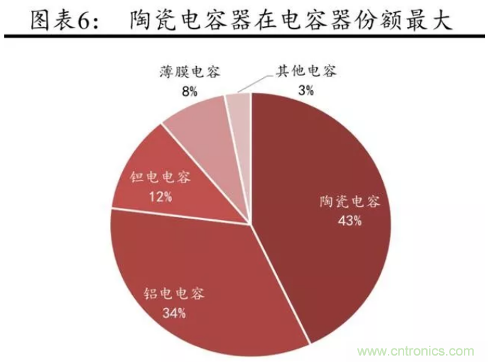 據(jù)中國產(chǎn)業(yè)信息網(wǎng) 2017年 5 月報道,陶瓷電容器在包括鋁電解電容 器、鉭電解電容器及薄膜電容器在內(nèi)的四類主要電容器中市場份額最高,達(dá)到約43%,是當(dāng)前生產(chǎn)規(guī)模最大、發(fā)展最快的片式元器件之一。