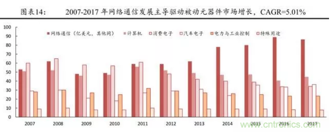 從被動元件的發(fā)展歷程來看,近些年來,產(chǎn)業(yè)鏈下游的需求擴大主導(dǎo)著被動元件市場的擴張。金融危機以來,全球電子元件市場規(guī)模的增長主要來自于網(wǎng)絡(luò)通信與汽車電子,尤其是智能手機。