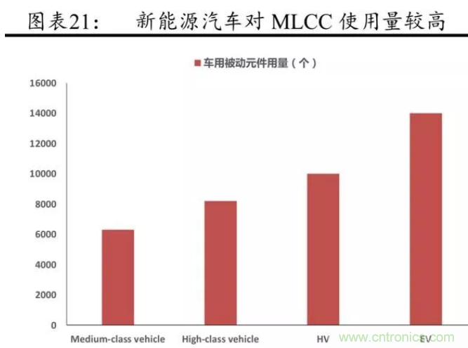 電動汽車對 MLCC 元件的需求量巨大,其中動力系統(tǒng)帶來的MLCC增量較為顯著。據(jù)前瞻研究院的數(shù)據(jù),每輛汽車使用的電子元件,中端車平均為 6300 個,高端車為 8200 個,純電動汽車增加到14000個,其中有一半是 MLCC,這意味著隨著新能源汽車的不斷普及,MLCC 需求量會不斷增長。