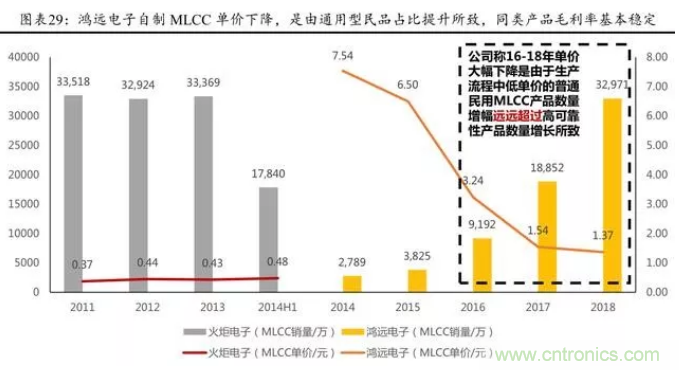 從各企業(yè)生產(chǎn) MLCC 價值量看,2014H1 火炬電子生產(chǎn)陶瓷電容 器平均單價為 0.46 元, 而鴻遠(yuǎn)電子 2014 年MLCC平均單價為 7.54 元,近幾年呈現(xiàn)下降趨勢, 我們判斷,整體主要是因為自制部分通用型民品的數(shù)量占比略有提升。