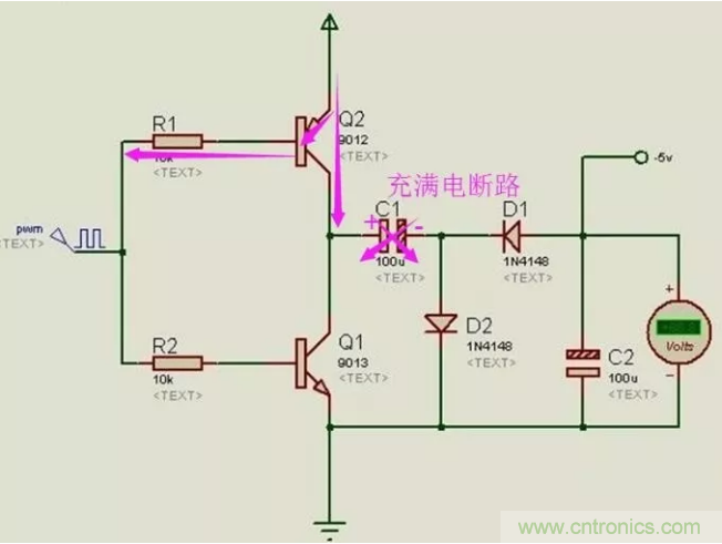 當(dāng)PWM為低電平時(shí),Q2關(guān)閉,Q1打開,C1開始放電,放電回路是C1-C2-D1,這實(shí)際上也是對(duì)C2進(jìn)行充電的過程。C2充好電后,下正上負(fù),如果VCC的電勢(shì)為5點(diǎn)幾伏,就可以輸出-5V的電壓了。