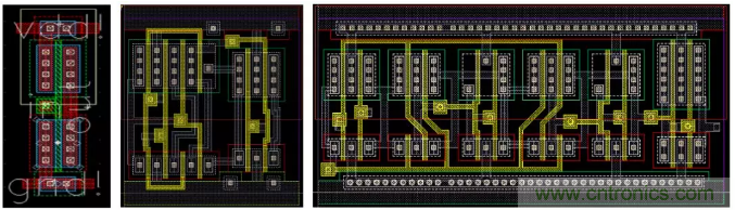 對(duì)于標(biāo)準(zhǔn)單元的版圖,根據(jù)工藝要求,標(biāo)準(zhǔn)邏輯單元的高度是固定的,寬度為最小單元寬度的公約數(shù)倍數(shù),例如在圖3中,左圖為反向器(inverter,INV)的版圖,中圖為選擇器(multiplexer,MUX)的版圖,右圖為D型寄存器的(D-Flip Flop, DFF)的版圖。如上所述,從版圖設(shè)計(jì)中,可以導(dǎo)出并建立GDSII和LEF文件。GDSII文件經(jīng)過(guò)設(shè)計(jì)簽核(design sign-off)過(guò)程由代工廠使用于芯片制造,LEF文件用于全芯片的P&R物理設(shè)計(jì)。