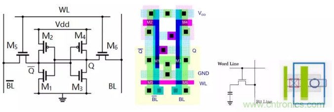 (從左往右: 6T-SRAM單元電路及其版圖, 1T1C-DRAM單元電路及其版圖)