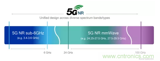 5G通信采用的頻段規(guī)范稱作“5G新空口”(5G New Radio,5G NR),使用6 GHz以下頻率以及毫米波波段,見圖5。數(shù)據(jù)率為10~20Gbps