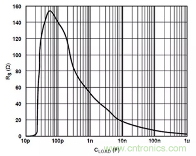 圖3:圖2中的電路在單位增益、±110V供電電壓及VOUT = 100Vp-p時,最大峰值為2dB對應(yīng)的RS與CLOAD關(guān)系曲線圖。(圖片來源:Analog Devices)