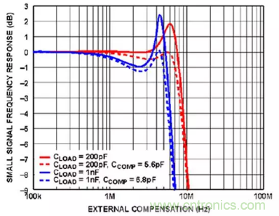 圖4:在單位增益、±110V供電電壓、VOUT = 100Vp-p、Rf = 0Ω 及 CCOMP = 5.6皮法 (pF) 時,ADHV4702-1的小信號頻率響應(yīng)與外部補(bǔ)償?shù)年P(guān)系曲線圖。(圖片來源:Analog Devices)