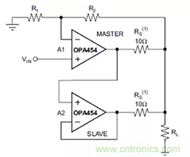 第一種方法是將兩個(或更多)OPA454AIDDAR并聯(lián)(圖5)