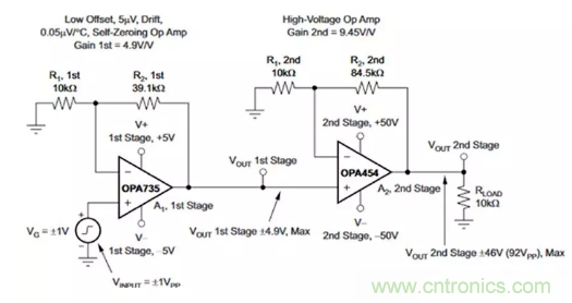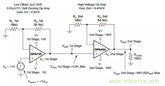 圖7:在OPA454的輸入路徑中加裝近零漂移運算放大器OPA735,會生成一個輸入失調(diào)溫度漂移非常低的兩級高壓電路。(圖片來源:Texas Instruments)
