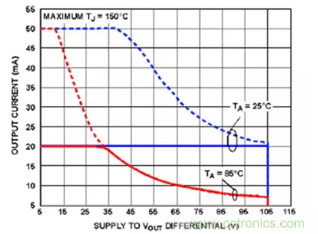 圖8:研究安全工作區(qū)域 (SOA) 曲線圖至關(guān)重要。ADHV4702-1的DC SOA由曲線下方的區(qū)域表示,曲線對應(yīng)的環(huán)境溫度分別為25°C和85°C,增益為20V,供電電壓為±110伏。(圖片來源:Analog Devices)