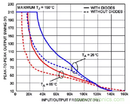 動態(tài)SOA也是要關(guān)注的方面。ADHV4702-1采用了內(nèi)部壓擺率升壓電路來實現(xiàn)19兆赫 (MHz) 小信號帶寬和74伏/微秒 (µs) 的壓擺率,但這種升壓電路可能會消耗大電流,具體取決于信號。為此,使用ADHV4702-1加裝外部二極管可限制差分輸入電壓(圖9)。