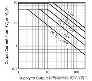 耗散極限不是靜態(tài)輸出功率的單變量函數(shù),它還受工作頻率和壓擺率的影響,這可能導(dǎo)致輸出級過熱。因此,對于任何此類驅(qū)動器,研究安全工作區(qū)域 (SOA) 曲線圖都至關(guān)重要。讓我們首先從ADHV4702-1的靜態(tài)SOA開始(圖8)。