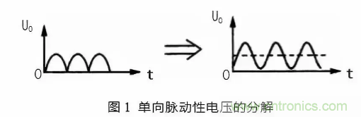 如圖 1(a)所示。是單向脈動(dòng)性直流電壓波形,從圖中可以看出,電壓的方向性無(wú)論在何時(shí)都是一致的,但在電壓幅度上是波動(dòng)的,就是在時(shí)間軸上,電壓呈現(xiàn)出周期性的變化,所以是脈動(dòng)性的。但根據(jù)波形分解原理可知,這一電壓可以分解一個(gè)直流電壓和一組頻率不同的交流電壓,如圖 1(b)所示。在圖 1(b)中,虛線部分是單向脈動(dòng)性直流電壓 U。中的直流成分,實(shí)線部分是 UO 中的交流成分。