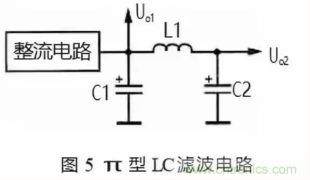 在圖 5 的電路中,整流電路輸出的單向脈動(dòng)性直流電壓先經(jīng)電容 C1 濾波,去掉大部分交流成分,然后再加到 L1 和 C2 濾波電路中。