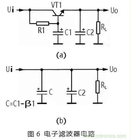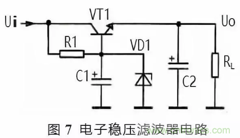 圖 6 所示是電子濾波器。電路中的 VT1 是三極管,起到濾波管作用,C1 是 VT1 的基極濾波電容,R1 是 VT1 的基極偏置電阻,RL 是這一濾波電路的負(fù)載,C2 是輸出電壓的濾波電容。