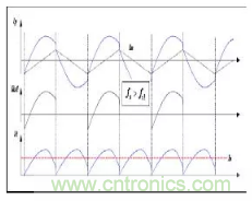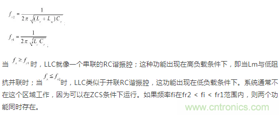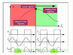 分析一下諧振頻率的方程式就會發(fā)現(xiàn),在高于峰值增益頻率時,諧振網(wǎng)絡(luò)的輸入阻抗是感抗,諧振網(wǎng)絡(luò)的輸入電流(Ip)滯后于諧振網(wǎng)絡(luò)的輸入電壓(Vd)。在低于峰值增益頻率時,諧振網(wǎng)絡(luò)的輸入阻抗變?yōu)槿菘?,并且Ip領(lǐng)先Vd。在電容區(qū)工作時,體二極管在MOSFET開關(guān)期間執(zhí)行反向恢復(fù)操作。