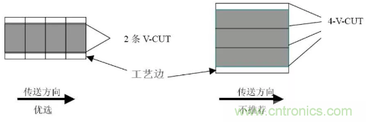 拼板方向應(yīng)平行傳送邊方向設(shè)計(jì), 當(dāng)尺寸不能滿足上述拼版尺寸要求的例外。一般要求“V-CUT”或郵票孔線數(shù)量≤3(對于細(xì)長的單板可以例外),見圖3.4。