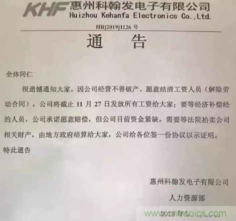 不僅僅是韓國LG因銷量下滑關(guān)閉PCB業(yè)務(wù),就在前幾日,PCB廠商惠州科翰發(fā)電子發(fā)出破產(chǎn)公告。公告稱,由于公司經(jīng)營不善導(dǎo)致破產(chǎn),和員工解除勞動合同并結(jié)清工資,將于11月27日發(fā)放薪資給大家,通告中特別說明公司愿意賠償給需要經(jīng)濟(jì)補(bǔ)償金的人員,只是由于公司資金緊缺,公司會和員工簽一份證明協(xié)議,待法院拍賣公司財(cái)產(chǎn)后由地方政府結(jié)算,也算是給員工一個交代。