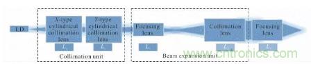 準(zhǔn)直單元改善光束的長寬比和平行度,但柱面透鏡尺寸較小,導(dǎo)致準(zhǔn)直光束腰斑較小。根據(jù)2.1節(jié)光參乘積不變原理可知,準(zhǔn)直光束仍存在束散角,為進(jìn)一步壓縮準(zhǔn)直光束的束散角,文中在準(zhǔn)直單元后引入激光擴(kuò)束單元。
