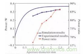 實(shí)驗(yàn)時,對LD加載4.0V的偏置電壓,使用激光功率計測量LD的輸出功率為376mW。為獲得光束整形后的功率密度,以光斑中心為圓心,測量不同直徑圓內(nèi)多個點(diǎn)的激光功率并取平均值,通過差分計算出相鄰?fù)膱A所形成的圓環(huán)內(nèi)激光功率及圓環(huán)面積,二者求比值,得到不同圓環(huán)內(nèi)的平均激光功率密度。文中測量的光斑直徑為1.00、1.25、1.50、1.75、2.00、2.25、2.50mm。圖12橙線為平均激光功率密度離散值所繪制的折線圖,其趨勢表明光斑半徑越大,激光功率密度越小。藍(lán)線為擬合離散數(shù)據(jù),為高斯曲線,近似代表聚焦透鏡焦點(diǎn)處光斑功率密度的整體分布。圖13是不同光斑直徑下激光功率仿真結(jié)果(藍(lán)色曲線)與實(shí)驗(yàn)結(jié)果(藍(lán)色折線)的對比,實(shí)驗(yàn)結(jié)果與仿真結(jié)果基本吻合。紅色折線為不同直徑光斑內(nèi)激光功率同二極管輸出總功率之比。由圖13可知,1mm直徑圓內(nèi)激光功率為252mW,約占LD出射光束總功率的67%。說明光束整形系統(tǒng)在實(shí)現(xiàn)提高激光功率密度的同時具備較高的功率傳輸效率。