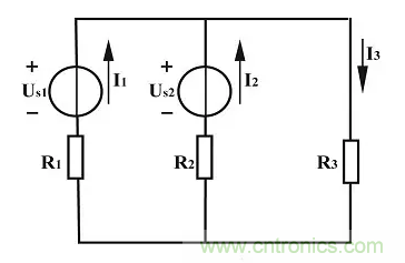 【例1】如上圖所示電路是汽車上的發(fā)電機(jī)(US1)、蓄電池(US2)和負(fù)載(R3)并聯(lián)的原理圖。已知US1=12V,US2=6V,R1=R2=1Ω,R3=5Ω,求各支路電流。