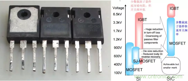 由SiC制作的MOSFET耐壓高,或者在同樣的耐壓要求下,MOSFET的尺寸就小,從而大大降低了MOS管的導(dǎo)通電阻和傳熱熱阻。