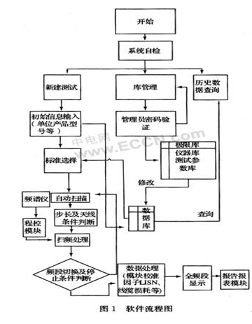 b.軟件構(gòu)成及功能:本軟件功能采用模塊化方法實(shí)現(xiàn)主要由界面參數(shù)輸入及數(shù)據(jù)顯示模塊、數(shù)據(jù)庫管理模塊、程控及自檢模塊、報告報表模塊組成。本EMI標(biāo)準(zhǔn)自動測試軟件具備以下功能:①參數(shù)設(shè)置,包括測試標(biāo)準(zhǔn)的選擇,測試配置的提示,測試參數(shù)的設(shè)置,如測試頻段、測量帶寬、檢波方式、掃頻步進(jìn)量、參考電平、分辨率帶寬、掃頻方式、傳感器系數(shù)、電纜損耗、衰減/放大器等;②控制儀器(頻譜分析儀)以一定的步長和速率對信號進(jìn)行掃頻測量、判別和讀出數(shù)據(jù);③數(shù)據(jù)處理能力.電磁輻射自動測量軟件能夠自動將測量的信號電壓轉(zhuǎn)換成干擾的量值,即自動補(bǔ)償因傳感器的使用而引起的隨頻率變化的校準(zhǔn)系數(shù),并可用線性或?qū)?shù)頻率坐標(biāo)顯示出信號的頻率分布,同時自動與相應(yīng)極限值進(jìn)行比較,判別信號是否超標(biāo)并在圖中表示出信號頻譜與極限值的關(guān)系;④數(shù)據(jù)的存儲和輸出能力,軟件可以將每次的測量數(shù)據(jù)以數(shù)據(jù)庫文件的形式進(jìn)行保存,需要時提取,特別是傳感器系數(shù)和測試極限值都以數(shù)據(jù)文件的形式保存,便于數(shù)據(jù)處理和查詢時調(diào)用。⑤數(shù)據(jù)庫管理功能。主要對各標(biāo)準(zhǔn)的極限值,天線校準(zhǔn)因子等進(jìn)行數(shù)據(jù)管理。系統(tǒng)工作流程圖如圖1所示。