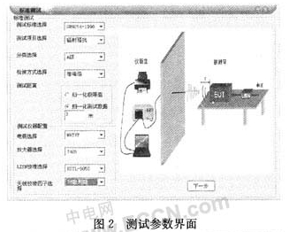 界面模塊貫穿于整個軟件系統(tǒng)是軟件的心靈之窗,它的優(yōu)劣直接影響了用戶使用整個系統(tǒng)的感受。充分考慮了用戶的需求和當(dāng)今軟件的發(fā)展趨勢之后,本文設(shè)計(jì)出人性化和易于理解的界面輸入程序。首先,標(biāo)準(zhǔn)選擇界面用戶只需選擇所需的標(biāo)準(zhǔn)系統(tǒng)會自動從數(shù)據(jù)庫篩選被選標(biāo)準(zhǔn)所規(guī)定的測試項(xiàng)目、分類、檢波方式、測試所需儀器等供用戶選擇并自動產(chǎn)生測試儀器連接配置圖。其次,軟件提供了多種界面風(fēng)格及色彩,加入了當(dāng)今軟件的流行元素,避免了用戶審美疲勞,如圖2、3所示。