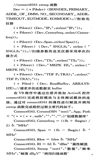 程控及系統(tǒng)自檢模塊均由VC++以控件形式實(shí)現(xiàn)。由于本系統(tǒng)使用的是NI公司的GPIB總線實(shí)現(xiàn)通信所以在VC++編程環(huán)境中,通過調(diào)用GPIB32.dll動態(tài)連接庫使用其內(nèi)部函數(shù)完成通信,儀器指令參照HP 8563EC編程指令編制主要代碼如下: