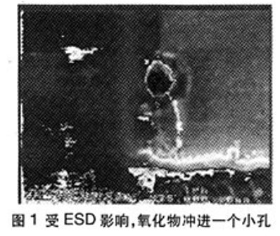 如圖1所示,電子部件受ESD影響時(shí),會(huì)發(fā)生什么?會(huì)產(chǎn)生一個(gè)細(xì)微的孔,氧化物將侵?jǐn)_部件。