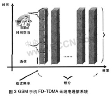 思考當(dāng)今電子世界,到處信號(hào)持續(xù)不斷地變化:音頻的輸入/輸出能產(chǎn)生輻射及傳導(dǎo)EMI,然后發(fā)射更高頻率的射頻線(xiàn),導(dǎo)致信號(hào)失真;手機(jī)天線(xiàn)(TDMA脈沖)會(huì)發(fā)射射頻信號(hào),此信號(hào)可被長(zhǎng)線(xiàn)頭戴式耳機(jī)接收,導(dǎo)致音頻信號(hào)通路中EMI噪音;GSM(全球通)手機(jī)標(biāo)準(zhǔn)使用頻分多路傳輸和時(shí)分多路傳輸,同時(shí)傳送大量電話(huà),如圖3所示。