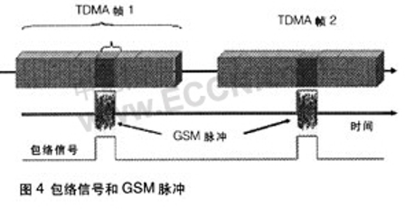 特定的手機(jī)只在屬于它的時(shí)間空當(dāng)發(fā)射。包絡(luò)信號(hào)的基本頻率是1/4.615 ms=217Hz。諧波頻率為434Hz、651Hz等。如此頻率是聽(tīng)得到的。如圖4所示,為手機(jī)的包絡(luò)信號(hào)。