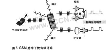 當(dāng)手機(jī)與基站通訊,或兩個(gè)手機(jī)彼此接近時(shí),發(fā)射脈沖通過(guò)擴(kuò)音器,揚(yáng)聲器,或頭戴式耳機(jī)線(xiàn)傳人音頻通路。見(jiàn)圖5。