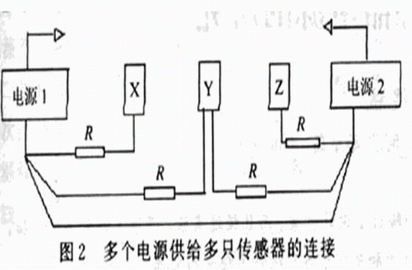 當(dāng)使用單電源供給多只傳感器時(shí),其連接方法如圖1所示,以盡量減少接地電阻引進(jìn)的干擾,若供電電源的壓降必須減到最小,則電源高端導(dǎo)線也可按相似的方法接線。