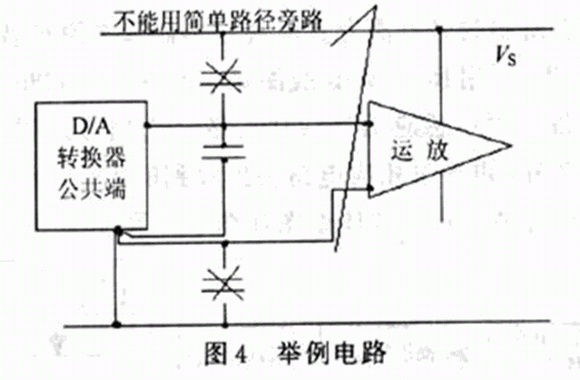 圖4說(shuō)明這樣一種方法,他應(yīng)用于模擬量輸出運(yùn)算放大器對(duì)于數(shù)/模轉(zhuǎn)換器數(shù)字驅(qū)動(dòng)噪聲的去耦,如果旁路電容隨意地直接接到電源的兩根母線之間,旁路電容起不到應(yīng)有的作用,甚至可能有害,他從"不干凈"的到"清潔"的Vs,為噪聲提供低阻抗的交流通路。