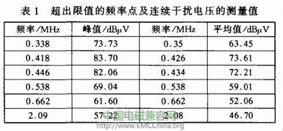 圖1是某一臺空調(diào)產(chǎn)品連續(xù)干擾電壓的測試曲線(執(zhí)行GtM343.1—2003《家用和類似用途電動(dòng)、電熱器具,電動(dòng)工具以及類似電器無線電干擾特性測量方法和允許值》l11)。表1是超出限值的一些頻率點(diǎn)及連續(xù)干擾電壓的峰值和平均值的測量值。