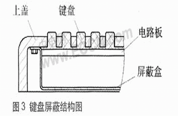 本終端鍵盤采用硅橡膠專用鍵盤,安裝在上蓋表面,開口較多,易引起電磁泄漏,降低屏蔽效能。因?yàn)榭卓p對(duì)電磁波的衰減與干擾波波長及孔縫尺寸有關(guān),一般應(yīng)使孔洞的尺寸遠(yuǎn)小于電磁波的波長,只要孔縫的直徑足夠小,就能夠達(dá)到所要求的屏蔽效能。但一般按鍵的大小、排列應(yīng)符合人們的操作習(xí)慣,按鍵太小使用不方便,故這里主要采取安裝屏蔽罩的方法來減少電磁泄漏。鍵盤的屏蔽結(jié)構(gòu)設(shè)計(jì)如圖3所示。