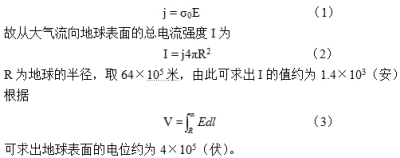 很多人都不清楚,地球也是一個帶電體。根據(jù)實(shí)驗(yàn)測試,在地球表面存在一個垂直向下的穩(wěn)定電場,電場強(qiáng)度E約為100伏/米,場強(qiáng)的大小隨高度的增加而減弱。另外,根據(jù)實(shí)驗(yàn)測試,在地面附近大氣的電導(dǎo)率σ0約為3×10-14西蒙/米,且隨高度的增加而增加。由此可知地球表面的電流密度j的方向指向地心,大小為: