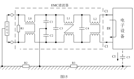 圖15與圖14相比,多了一個L0低通電感濾波器,目的是為了提高對外來傳導干擾信號的抑制能力。如果只考慮提高抑制本電子設備干擾的能力,可把C1、C2的連接位置移放到電源線的最前端,即:盡量靠近測試儀表的接入處,抑制干擾效果會更顯著。需要檢查電子設備對外來電磁干擾信號的抑制能力,可在電源線輸入端輸入一個干擾信號,然后檢測電子設備被干擾影響的程度,如:電視機出現(xiàn)行掃描不同步等。對不同的電子設備,干擾信號也有不同的要求,這些標準制定一般都是由行業(yè)協(xié)會提出,最后由標準制定單位推薦使用。