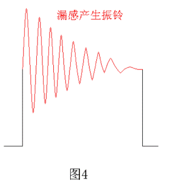 由于變壓器的初級有漏感,當電源開關(guān)管V1由飽和導通到截止關(guān)斷時會產(chǎn)生反電動勢,反電動勢又會對變壓器初級線圈的分布電容進行充放電,從而產(chǎn)生阻尼振蕩,即產(chǎn)生振鈴,如圖4所示。變壓器初級漏感產(chǎn)生反電動勢的電壓幅度一般都很高,其能量也很大,如不采取保護措施,反電動勢一般都會把電源開關(guān)管擊穿,同時反電動勢產(chǎn)生的阻尼振蕩還會產(chǎn)生很強的電磁輻射,不但對機器本身造成嚴重干擾,對機器周邊環(huán)境也會產(chǎn)生嚴重的電磁干擾。