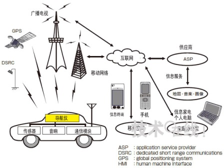 首先介紹車載導(dǎo)航儀的多功能化和高速化。眾所周知,車載導(dǎo)航儀的出發(fā)點(diǎn)是導(dǎo)航,然后才是通過DSRC(Dedicated Short Range Communications )、電視、移動(dòng)網(wǎng)絡(luò)等通信手段與車外相連接?,F(xiàn)在,車載導(dǎo)航儀已不再是單純的指路工具,而是發(fā)展成為了能夠借助各類供應(yīng)商進(jìn)行多種內(nèi)容交換的雙向交流裝置。為了向駕駛員提供安全、放心、便利、舒適的駕駛環(huán)境,車載導(dǎo)航儀正在向聯(lián)結(jié)人與機(jī)械(這里指汽車)的HMI(Human Machine Interface)中心轉(zhuǎn)變(圖1)。