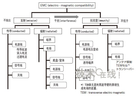 圖6給出的樹形圖對(duì)于理解EMC的整體結(jié)構(gòu)很有幫助,本公司的內(nèi)部培訓(xùn)也經(jīng)常使用。這是按照發(fā)射/抗擾度、傳導(dǎo)/輻射的組合,把EMC分成四個(gè)大類進(jìn)行整理的方法。其中,在設(shè)計(jì)階段的EMC研究和測量精度方面,尤其需要注意的是電場的輻射。