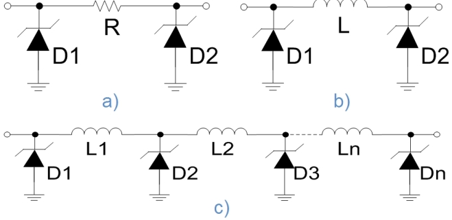 圖2:集成型EMI濾波+ESD保護方案:a)π型RC;b)π型LC;c)LC梯形