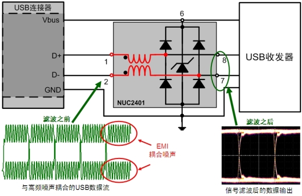 圖5:帶超低電容ESD保護的集成CMC濾波器NUF2401MN用于USB2.0等高速應(yīng)用。